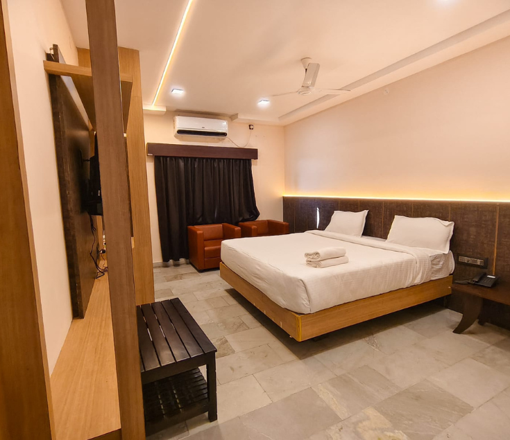 Our Double Deluxe A/C Room offers enhanced comfort with spacious interiors and elegant furnishings. Designed for relaxation and convenience, the room features comfortable bedding, air conditioning, and modern amenities to ensure a pleasant stay.